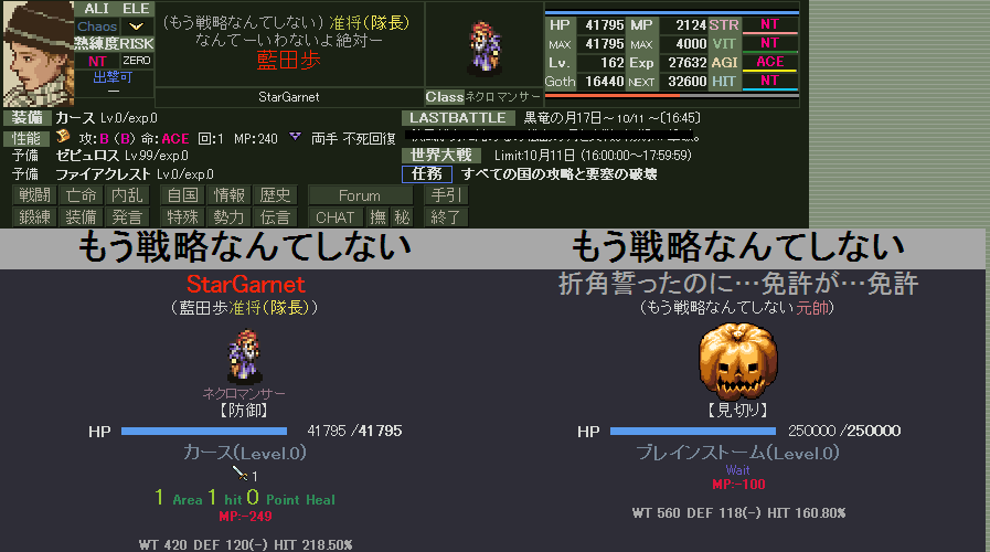 適当に凸しつつ隊長就いたりしてマッタリやってました。 もしかして今日はオン少なくて統一ないんじゃね? と、馬鹿なこと考えてたらカースを拾いました。 ヒーリングとは縁がなかったけどカースとは縁があるようで・・w というわけで早速つかってみますた。 ( ゚д゚ ) えー。 まずヒール系の魔法の説明を… ヒーリング、カース メイン武器にすると自国が戦闘対象となる。 →HP9割切ってる人を回復できる →回復可能な人がいない場合NPッぽく表示される。 これが普段の状況です。 大戦終わってからカース持って確認したところNP状態の表示が出ました。 (戦略中) →HP9割切ってる人を回復できる →回復可能な人がいない場合要塞が選べる。 戦略中だと本当に回復できるのかねぇ・・・? 要チェックな現象が1つ増えましたとさ。 回復量が少ないけれども誰でも要塞回復ができるかもしれない。 チェック事項 ・いつ要塞が選べるのか(多分、戦略中) ・どのくらい回復できるのか(んー杖ナシで1万くらい~?) ・要塞回復はどのクラスでも出るのか(ネクロ以外で可能かどうか) とりあえずこんなもんか。 しばらくしたらV鯖でやってみます。 やりたい方いたら、どうぞ。どうぞ。