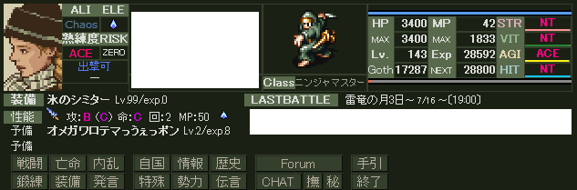 武器のレベル上げをし、VX鯖ではユニットを作って半放置。 戦略があったので登録一日経ってもいないFの分際でリストをするという暴挙に… まだまだ放置は続きます… |